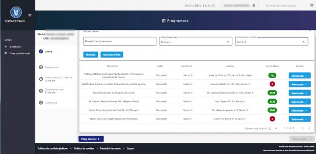 Nu știu exact la ce se referă “locuri libere”, adică pe ce perioadă se calculează. Am ales un centru, a apărut o pagină de calendar cu numărul de locuri libere în fiecare zi, așa că am ales o zi și o oră, că au și număr de locuri pe fiecare interval orar.