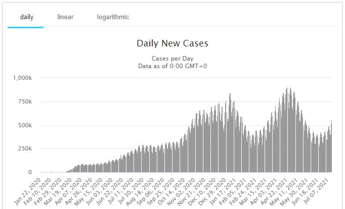 Se vede deja valul 4 în statistici. Iată-l crescând acolo la final în graficul mondial de cazuri de covid: