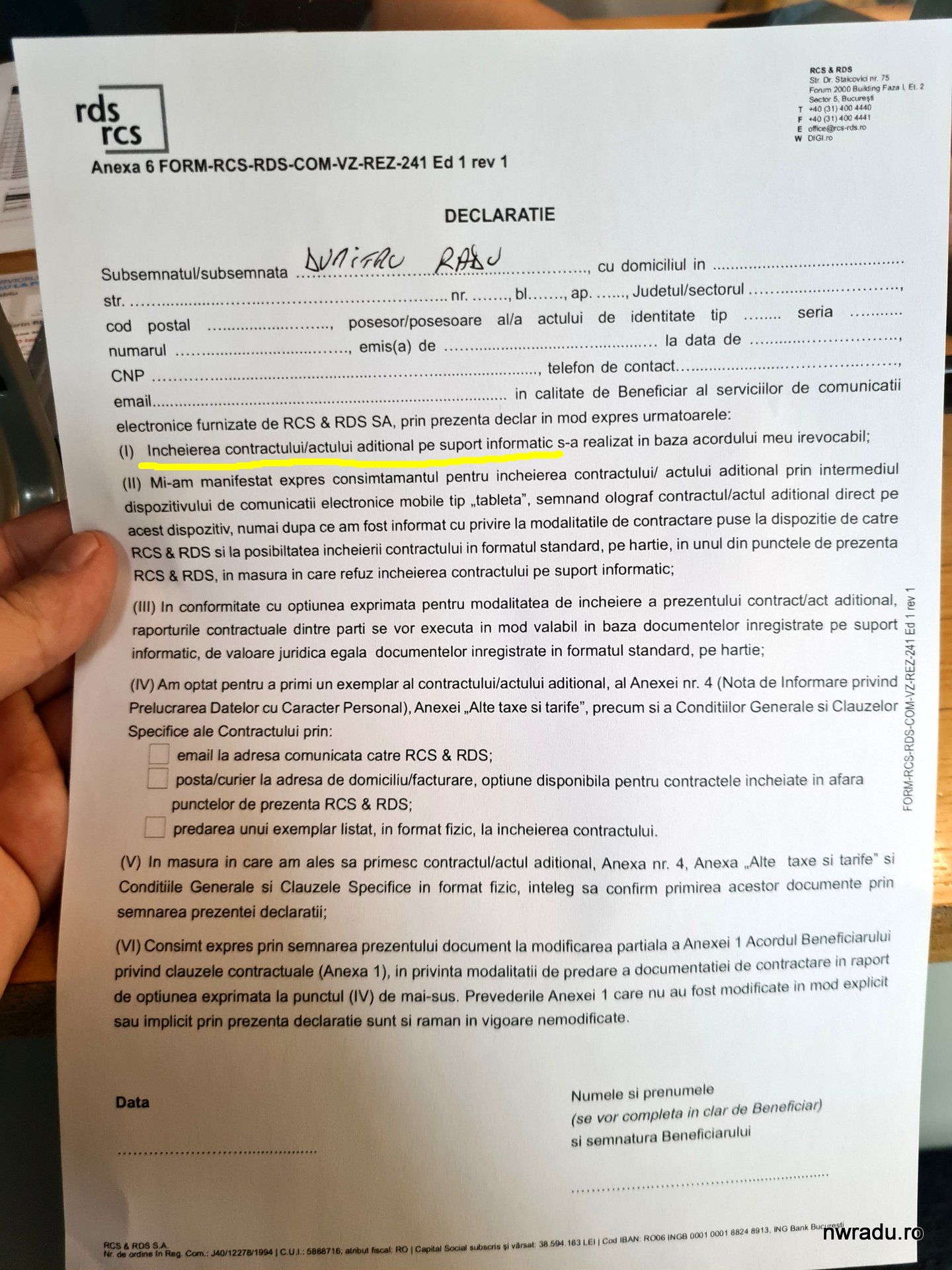 Documentul ala fizic pe care l-a semnat Radu nu are legatura cu procedurile Digi, sunt multe alte companii care au aceleasi reguli. Asa este peste tot, fiindca daca se ajunge vreodata in instanta nu sunt recunoscute semnaturile electronice pe tableta. Trebuie acel document initial, ulterior nu va mai fi nevoie sa semnezi fizic.