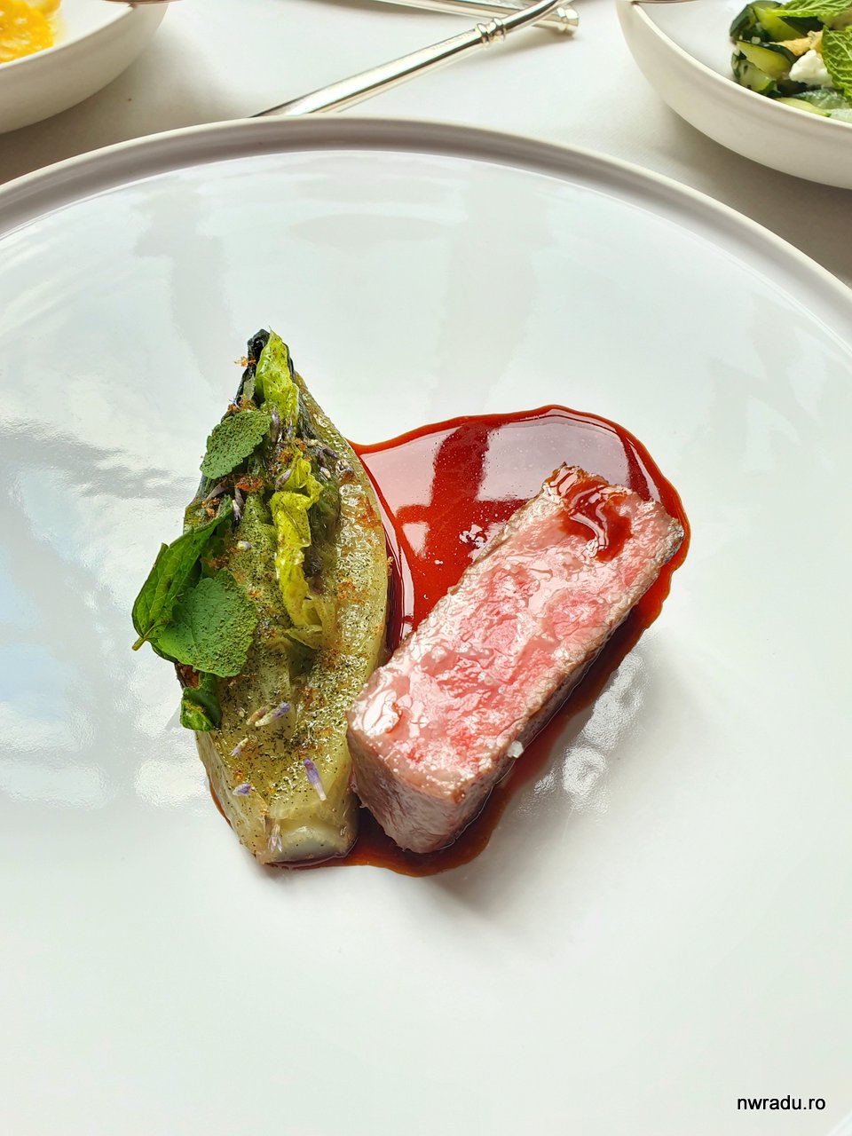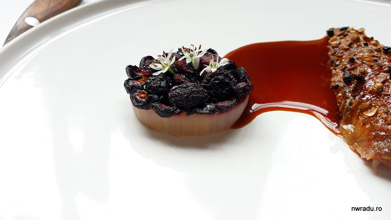 Moving on, eu am avut vită maturată 120 de zile, servită cu salată și frunze de la o specia de lavandă. Matilda a avut o rață maturată, glazurată cu miere și servită lângă o tartină de ceapă, ciuperci și coacăze, cu un aranjament făcut de ziceai că este o floare.