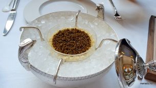 Primul fel a fost un caviar de semințe de bame cu smântână, iar separat au venit două lipii micuțe de pâine de porumb cu bame coapte pe ele. Puneai niște “caviar” pe ele și mâncai așa. Mi-a plăcut că servirea a fost exact ca pentru caviar clasic, cu farfuriuță pusă pe gheață, în “utilajele” corecte pentru așa ceva.