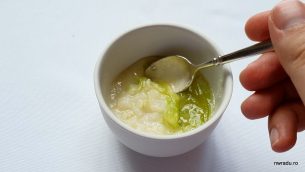 Tot aici ne-au dus pe masă și porumb dulce cremos, făcut așa cu o spumă de gălbenuș de ou și muguri de chives, care-i o formă de usturoi, și un bol cu salată de zucchini pe un pat de avocado, cu bucățele de brânză feta și frunze de mentă.