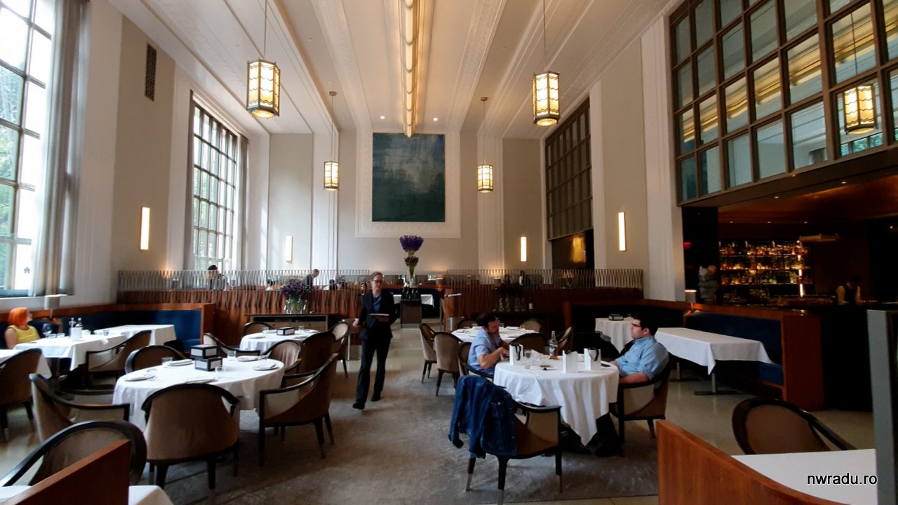 Rezervarea o făcusem pe 2 august. Restaurantul este la parterul unei clădiri impozante de pe Madison Avenue, lângă parcul Madison din centru. Înăuntru are un spațiu larg, cu mese ample și bine separate ca să nu te deranjeze alții. Decorul mi s-a părut stil art deco.