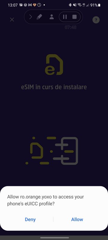 După validare, aplicația mi-a instalat eSIM-ul în telefon, ceea ce a durat cam 30 de secunde, apoi am primit vreo 2 SMS-uri de configurare și recomandarea de a reporni telefonul. Am primit inclusiv o întrebare pe care nu am mai văzut-o până acum de la Android, anume dacă permit aplicației YOXO să acceseze setările eUICC ale telefonului meu, adică permisiunea de a instala un eSIM. 10 minute de la cap la coadă, pe ceas, îl puteți vedea în colțul din stânga-sus.
