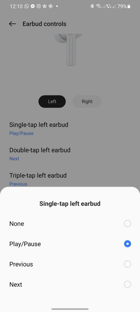 O altă pagină te lasă să configurezi apăsările pe fiecare cască în parte. Mi-a plăcut că un double-tap pe casca stângă poate fi clasicul Next Song, dar double-tap pe casca dreaptă poate fi pus ca Voice Assistant. Dacă ții apăsat pentru o secundă poți avea o altă comandă (eu am pus trecerea între max noise cancelling și deloc)