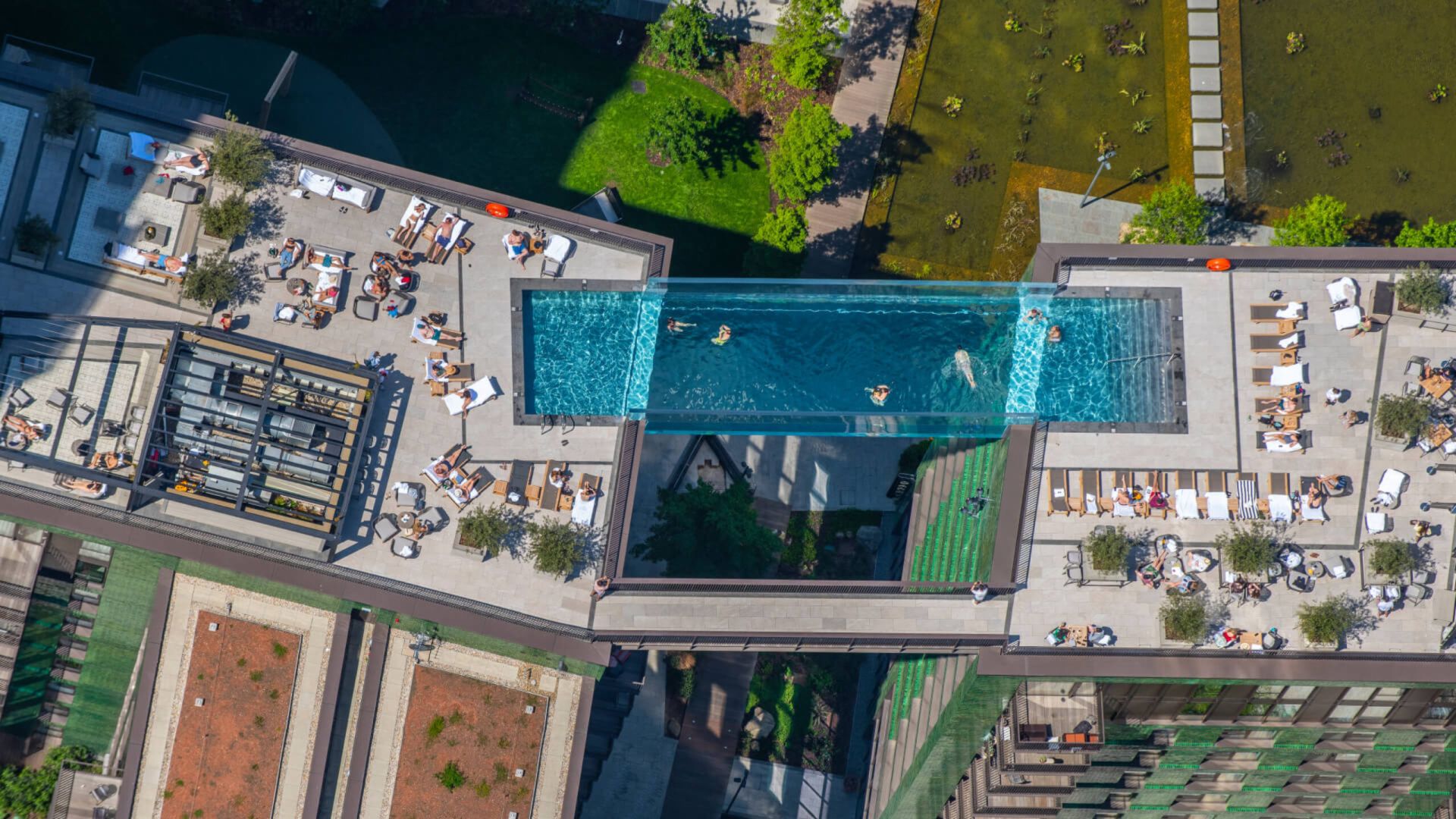 Șmecheria la ele este că două clădiri sunt unite printr-o piscină transparenta, la nivelul acoperișului. Piscina are 25 de metri lungime, s-ar putea să fie cea mai lungă piscină transparentă din lume, și îți permite să înoți de pe o clădire pe alta, în timp ce prin apă, sub tine, vezi strada la 30 de metri mai jos. Sau să stai în apă, ca și cum ai fi suspendat în mijlocul cerului, între cele două clădiri.