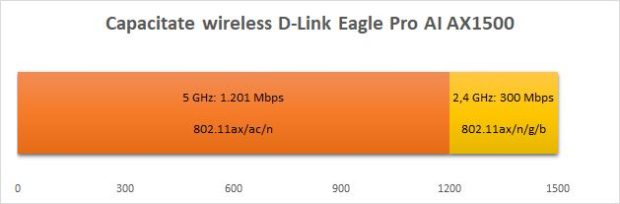 Capacitate totală AX1500, formată din 1.201 Mbps pe banda de 5 Ghz (801.11a/n/ac/ax) și 300 Mbps pe banda de 2,4 GHz (802.11b/g/n/ac).