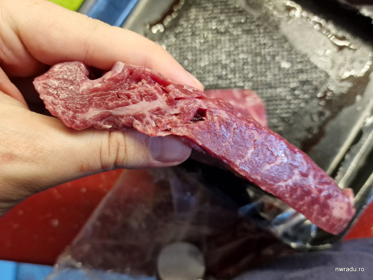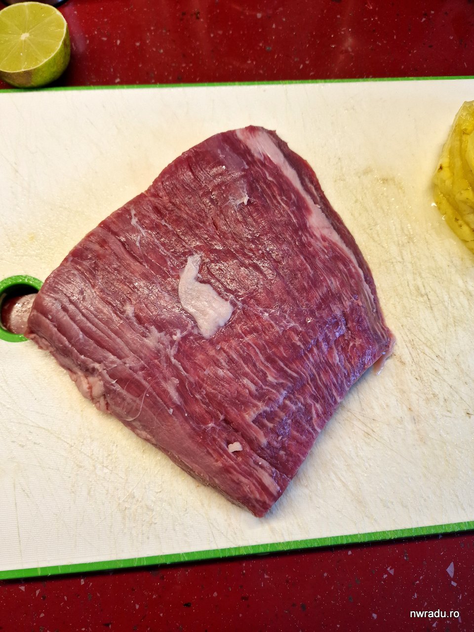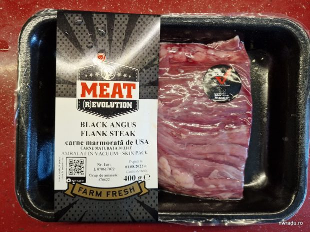 Anyway, în secțiunea Save Me au dus carne de vită Black Angus maturată, origine SUA, ambalată de Meat Revolution. Am luat de-a lungul timpului din toate tipurile de cut-uri disponibile acolo (rib-eye, denver, flank, vrăbioară etc) și una dintre ele este mult mai bună decât celelalte: mă refer la Flank Steak, care este moale și gustoasă.