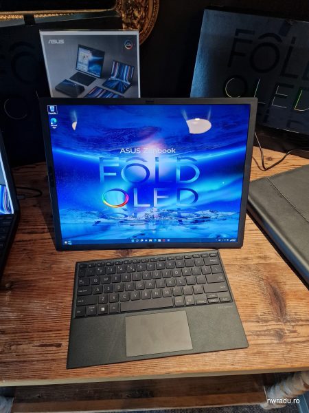 Realist vorbind, este și cel mai portabil laptop de 17 inci. Adică inițial ai spune că de fapt lucrurile se așază împotriva lui Zenbook 17 Fold. Îl iei în mână și te surprinde pentru că-i greu (are 1,5 kg fără tastatură, 1,8 kg cu tastatura), tu așteptându-te totuși la o tabletă. Îl pliezi și, cu ecran pe din două, plus tastatura care intră în mijlocul său, este gros cam cât trei telefoane mobile, are vreo 3 cm.