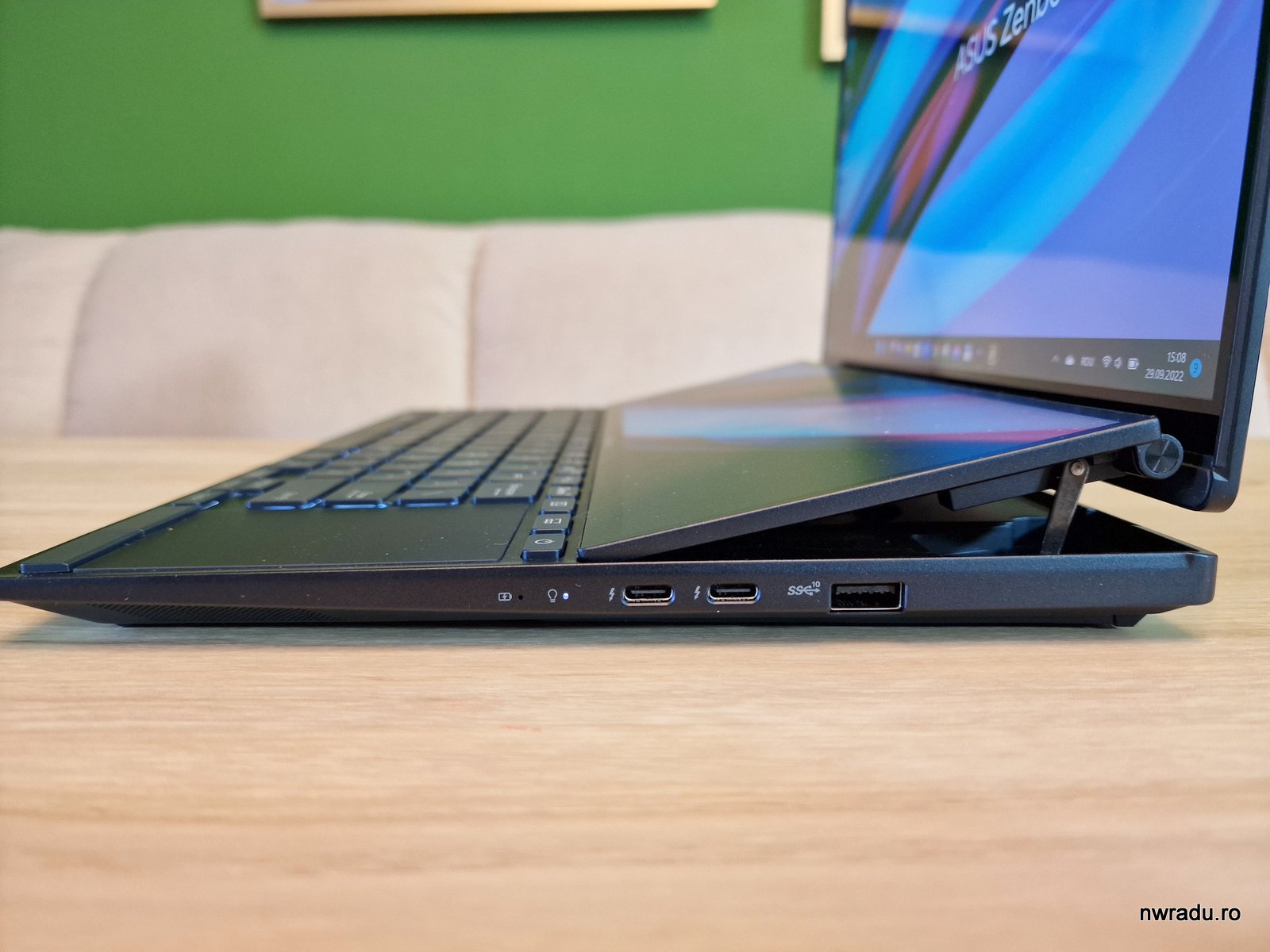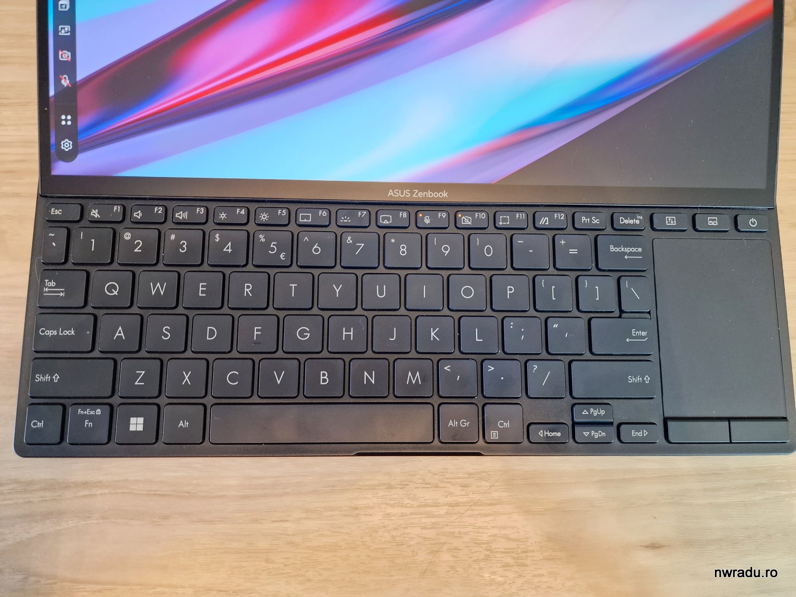 Ecranele: cel principal este un OLED de 550 nits, diagonală 14,5 inci, rezoluție 2.880 x 1.800 pixeli și refresh la 120 Hz, 100% DCI-P3, certificat Pantone, tratat anti-reflex. Ecranele OLED abia intră pe laptopuri și sunt wow, atrag imediat privirea prin culorile lor excelente. Ecranul de jos este un IPS tactil și el, 2.880 x 864 pixeli, diagonală 12,5 inci. Ai și stylus în cutia laptopului, apropo.