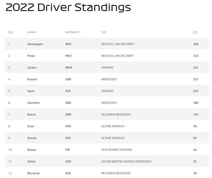Sunt câteva elemente de observat însă în clasamentul general. În primul rând, Perez a trecut pe locul 2, are un punct în fața lui Leclerc. În următoarele curse cred că Red Bull va încerca să-l bage pe mexican în față pentru a încheia sezonul cu un 1-2 clar in clasament.