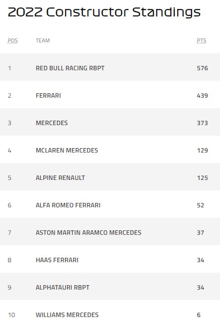 De exemplu, bătălia pentru locul 2 este mai aprigă ca oricând, Leclerc și Perez fiind practic la egalitate. Același lucru și pentru locurile 4 și 5, unde Russell și Sainz sunt practic la egalitate. Mai sunt 5 curse în acest sezon.