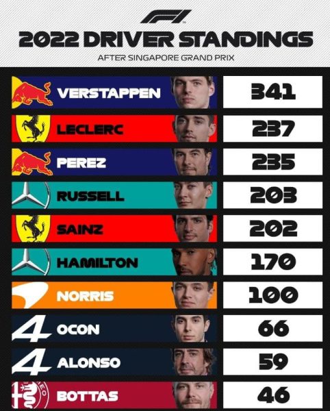În clasamentul constructorilor, Ferrari a luat avans față de Mercedes. Ferrari a terminat locurile 2 și 3 în Singapore, pe când Mercedes a luat doar 2 puncte prin Hamilton. Mercedes are în continuare șanse la locul 2, zic eu, dar nu mai depinde doar de ei. Dacă Ferrari păstrează un ritm bun de cursă și face puncte, păstrează locul 2. Dacă mai trec prin abandonuri, este posibil să-l piardă.