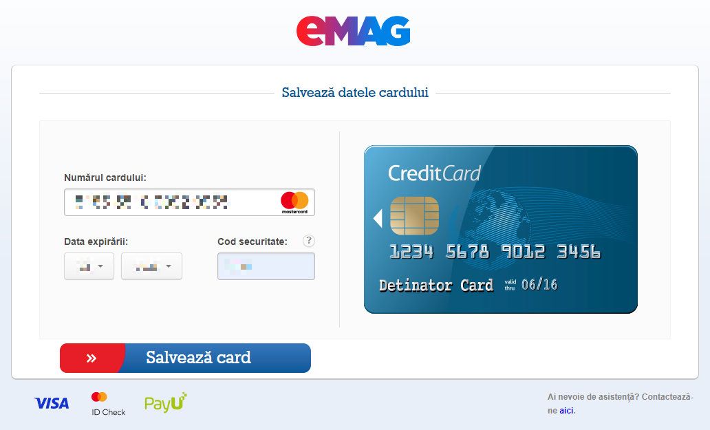 Iată cum se salvează un card bancar în contul eMAG. Un card salvat în cont are avantajele sale: îl alegeți direct pentru plată când dați o comandă, ca să nu mai pierdeți vremea introducând manual datele sale, ceea ce este foarte important la început de Black Friday. De asemenea, datele sale sunt în siguranță, sunt păstrate criptat pe site-ul procesatorului PayU (unde oricum le-ați introduce manual de fiecare dată), eMAG nu află decât ultimele cifre.