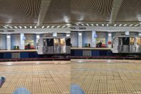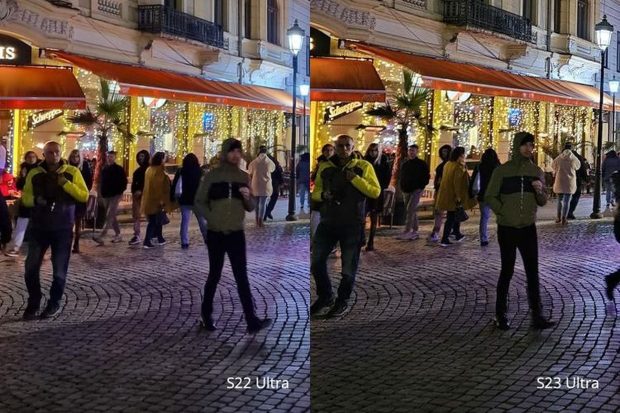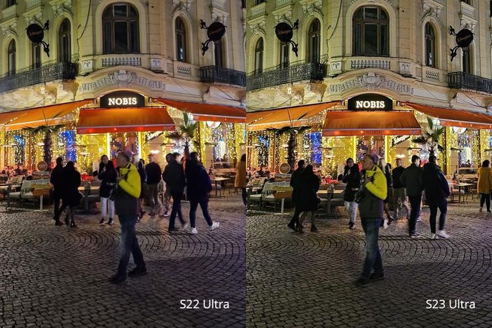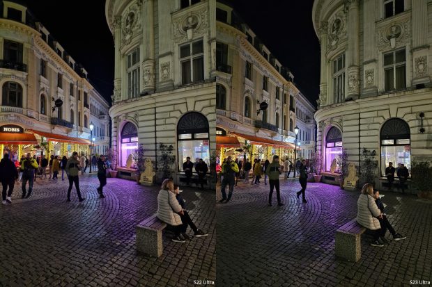 Diferențe pot fi văzute abia la crop 100%. Acel semn Nobis are un mic halou în jurul său pe S22 Ultra, iar fețele oamenilor au mai puține detalii de la sharpening mai agresiv.