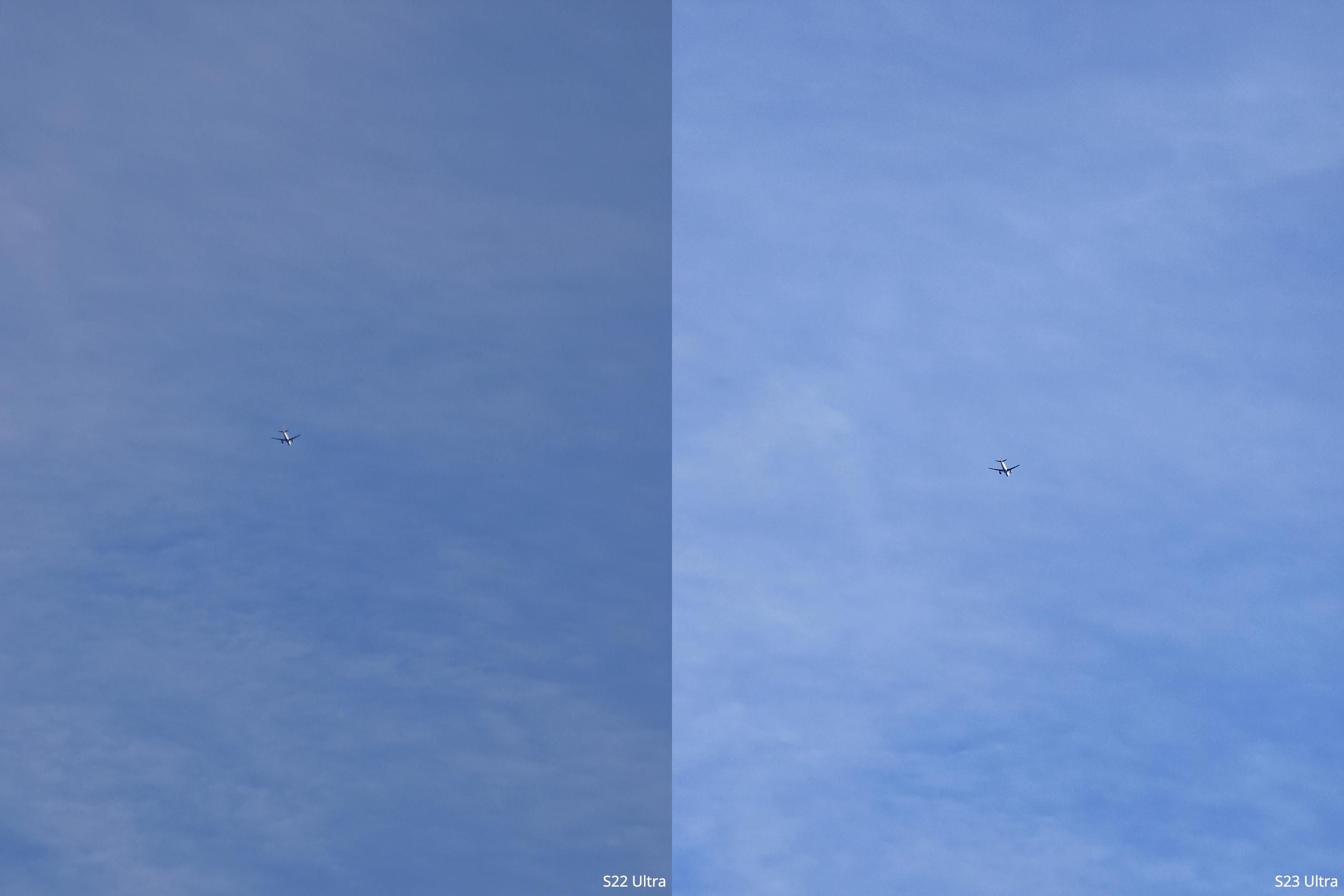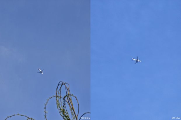 S23 Ultra a procesat mai finuț imaginea, se vede diferența în algoritmul de sharpening și reducere de zgomot. Personal sunt uimit de cât de bine au focalizat ambele telefoane, mie fiindu-mi chiar greu să ochesc avionul care deja se îndepărtase. În cele din urmă, însă, S23 Ultra obține un rezultat mai bun.