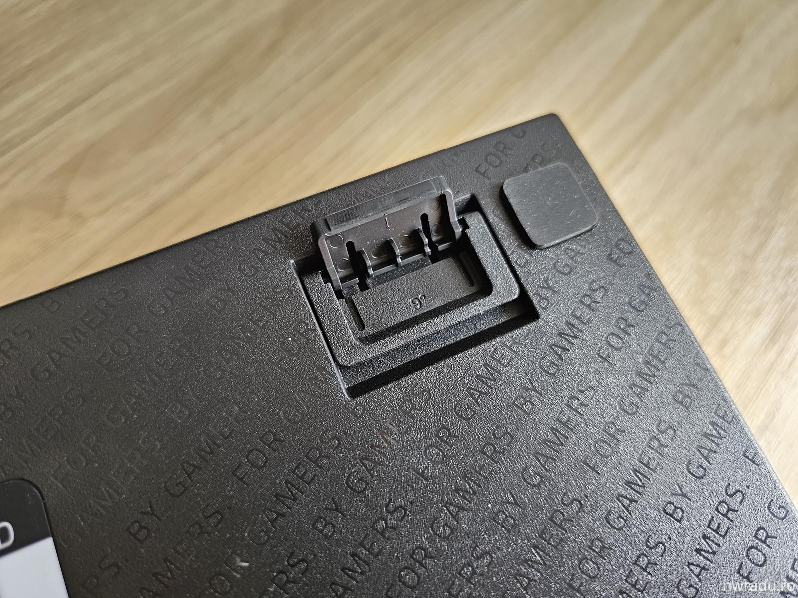 Baza tastaturii mi s-a părut deosebit de groasă. Este din aluminiu, iar cele patru picioare de cauciuc ar fi putut fi un pic mai mari sau mai groase. Tastatura are și piciorușe, câte două la 6 și respectiv 9 grade înclinație. Pe spate este ștanțat peste tot mesajul For Gamers, By Gamers, vizibil de fapt doar când pică lumina bine.