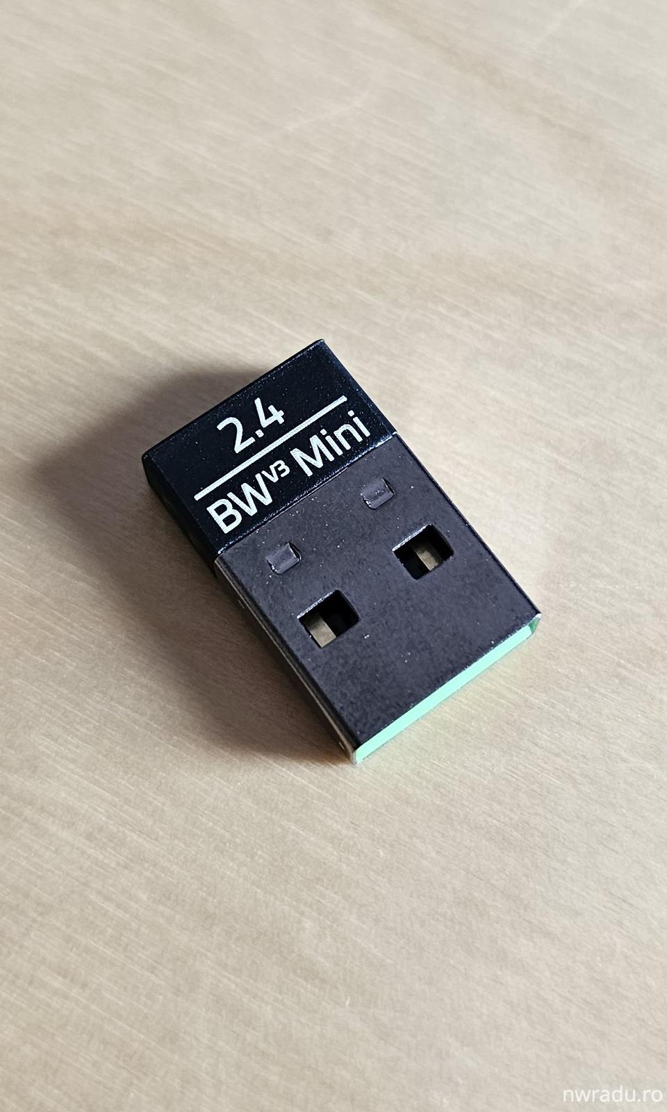 Dongle-ul USB Hyperspeed este inclus, se găsește într-un mic locaș din tastatură, sub un capac.