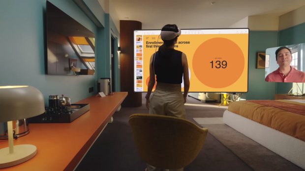 Vision Pro poate rula direct aplicații în cască. Te poți uita la filme și fotografii, poți vorbi cu alții direct de acolo, poți vedea obiecte 3D. Un buton de reglaj îți permite să alegi cât de imersivă este viziunea adăugată de cască peste mediul tău înconjurător.