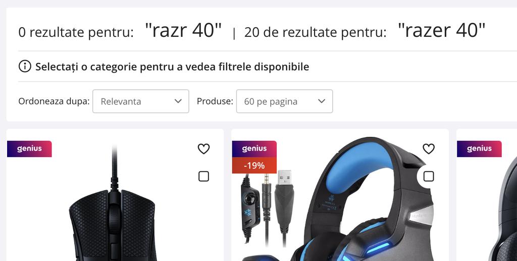 Culmea, apare la căutarea “motorola razr 40”, dar cu eroare că de fapt este ca rezultat pentru “razer 40”.