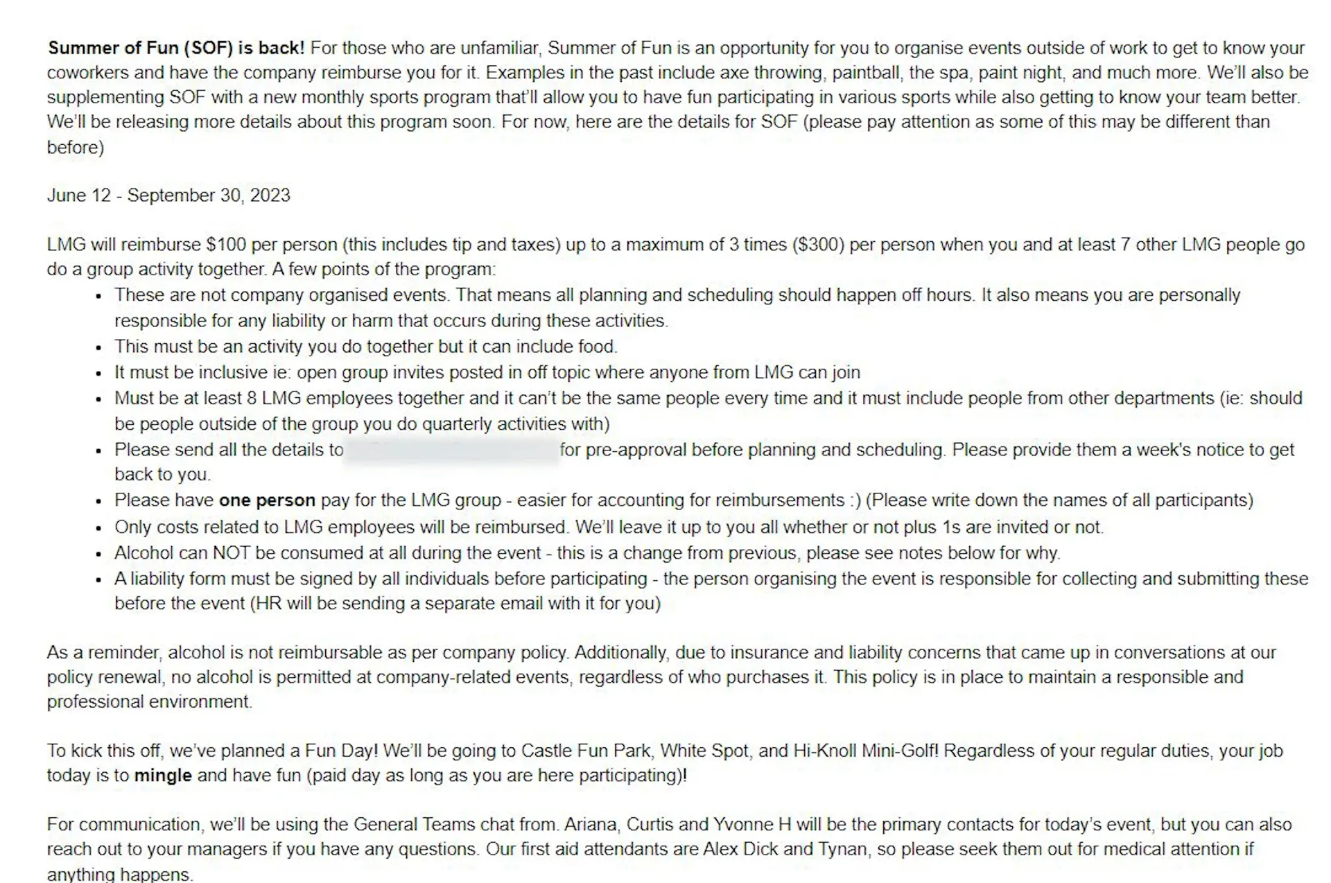 Al doilea cadru zice că firma încurajează angajații să facă diverse activități împreună. Dacă se strâng 8 angajați pentru o activitate (paint ball, sport etc), firma le dă 100 de dolari de persoană pe cheltuieli, inclusiv bacșișuri. Sunt diverse condiții pe acolo, dar mi se pare un beneficiu bun. Putea lipsi și nimeni n-ar fi avut o problemă cu asta, iar faptul că totuși l-au introdus de ani de zile mi se pare lăudabil.