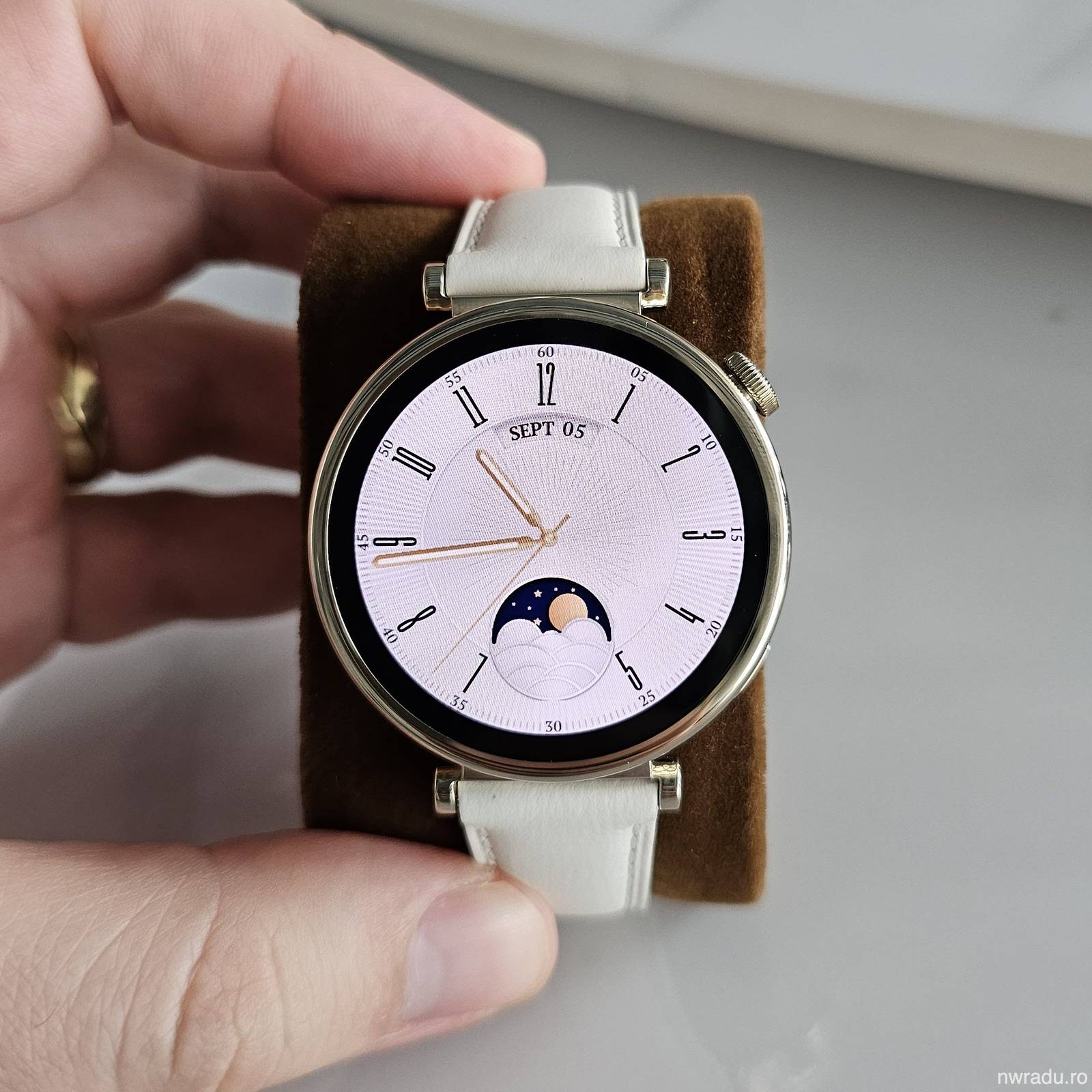 Variantele de 41 mm ale lui Watch GT4 probabil sunt un alt motiv pentru care Huawei câștigă cotă de piață pe smart watch-uri. Cred că sunt singurele ceasuri din piață cu design gândit pentru femei. Diagonală mică, aspect plăcut, bezel subțire. Sunt disponibile cu trei curele care arată foarte bine, în special cea “milaneză” cu zale foarte mici și închidere magnetică (1.399 lei la eMAG sau Huawei Store). O poți regla practic la milimetru, închizând-o unde vrei tu cu cei doi magneți de pe brățară, și nu m-ar mira să fie cea mai vândută din serie.
