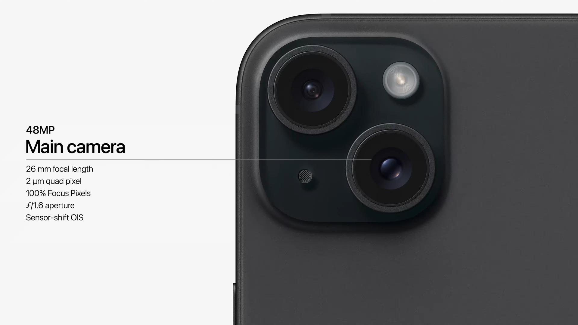 Camera principală are tot un modul de 48 megapixeli f/1,76. Și iPhone 15 Pro folosește un algoritm hibrid de binning, adăugând detaliile din imaginea de 48 megapixeli peste cea luminoasă obținută prin binning-ul la 12 megapixeli. Rezultă o fotografie de 24 megapixeli.