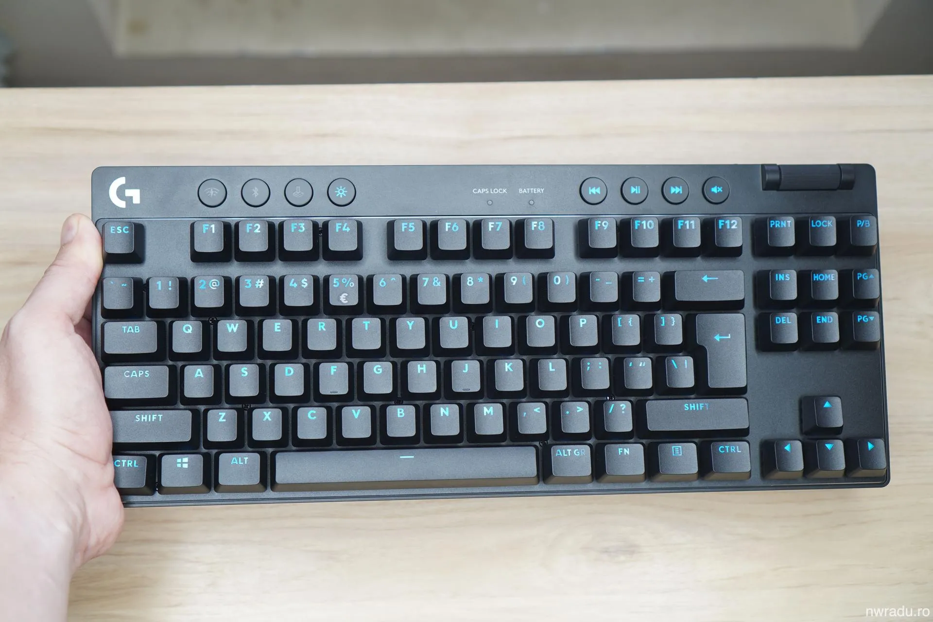 PRO X TKL este și wireless, apropo. Este compatibilă Lightspeed, același protocol Logitech cu lag foarte mic pentru timpul de răspuns. Împreună cu mouse-ul de mai sus poate folosi același dongle, cu polling rate de 1000 Hz.