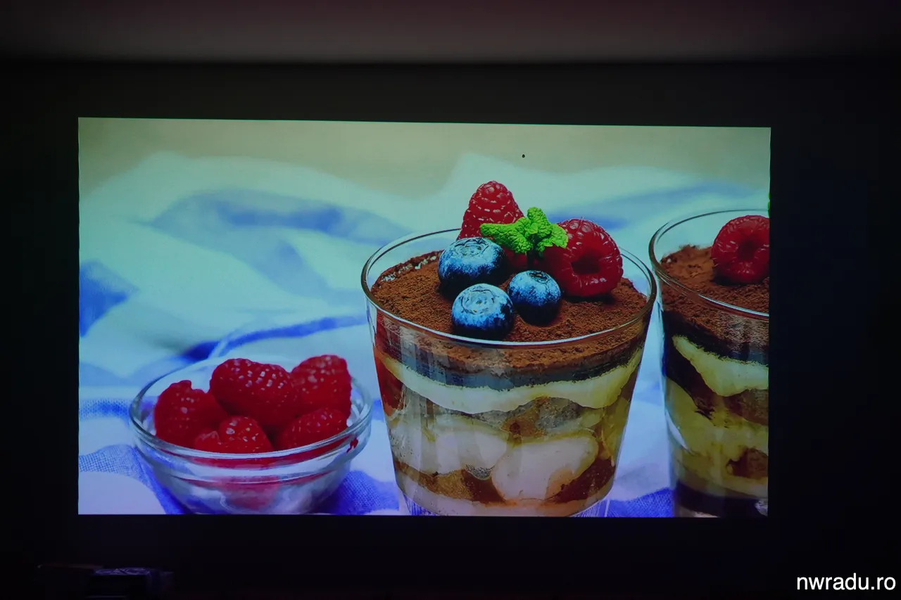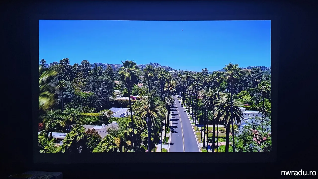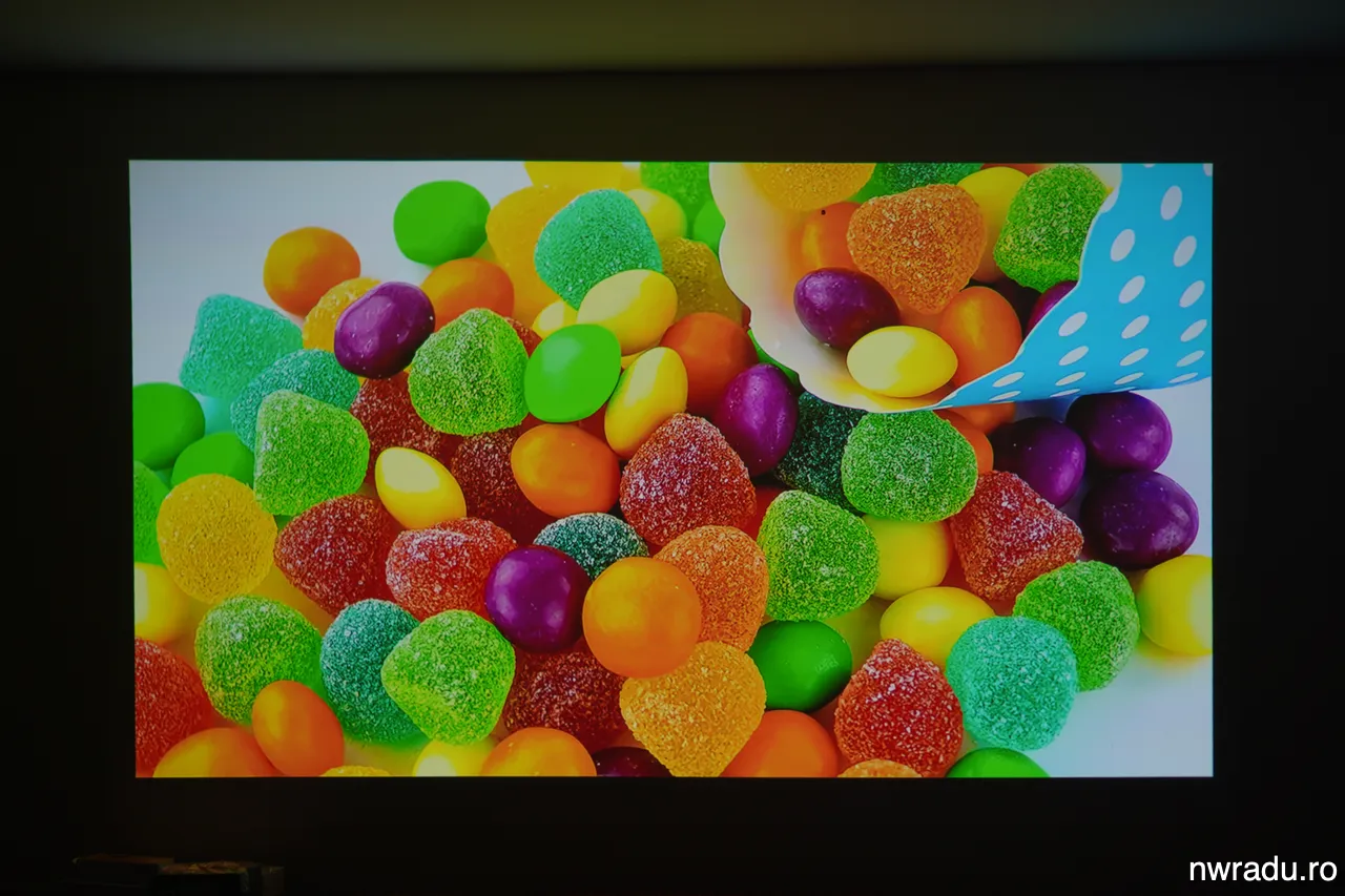 Chiar și noaptea însă, imaginea este una decentă ca luminozitate. În testele mele, lampa nu trece de 400-500 nits, pe când un televizor modern poate afișa imagini strălucitoare de 800 nits și chiar mai mult. Are și problema clasică a proiectoarelor de tip DLP, anume că negrul absolut nu este chiar negru, ci un gri foarte închis.