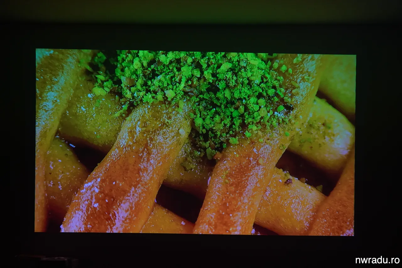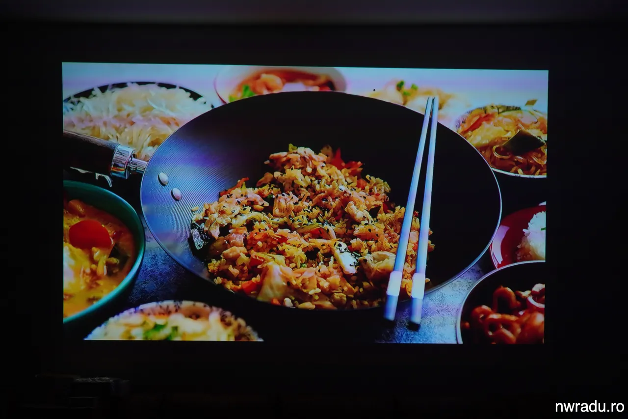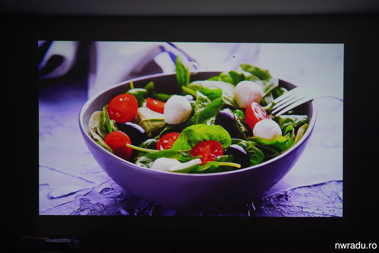 Chiar și noaptea însă, imaginea este una decentă ca luminozitate. În testele mele, lampa nu trece de 400-500 nits, pe când un televizor modern poate afișa imagini strălucitoare de 800 nits și chiar mai mult. Are și problema clasică a proiectoarelor de tip DLP, anume că negrul absolut nu este chiar negru, ci un gri foarte închis.