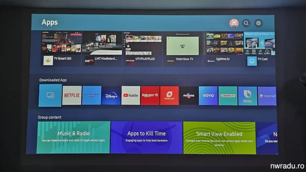 Proiectorul are un sistem de operare Tizen ca și pe smart TV-urile Samsung de ultimă generație. Există foarte multe aplicații ce pot fi instalate, inclusiv cele mai importante precum: Netflix, YouTube, Disney+, HBO Max, SkyShowtime, Prime Video, Digi Online, Orange TV, Vodafone TV, Spotify (ca să asculți Freestyler de la Bomfunk MCs, desigur), GeForce Now și altele. Pe majoritatea le-am găsit deja preinstalate, iar restul sunt în magazinul de aplicații.