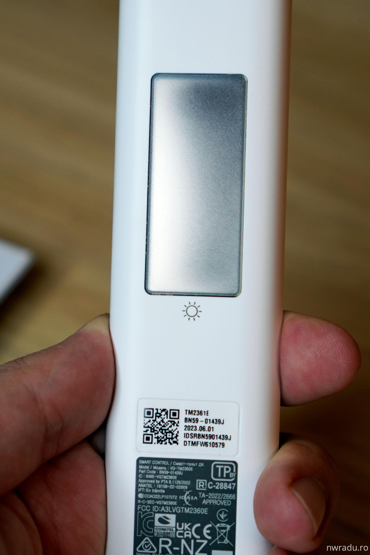 Telecomanda este albă, subțire, frumos rotunjită. Are o baterie incorporată care se poate încărca prin USB-C la nevoie și în mod normal cu celule solare de pe spatele telecomenzii, parte a strategiei Samsung din ultimii ani de a reduce consumul de baterii alcaline și de a simplifica produsele proprii.