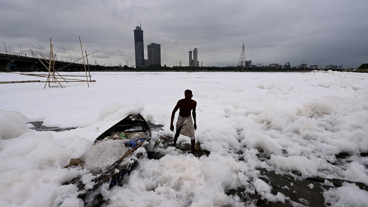 Poluare cum nu poți vedea nicăieri în Europa și te face să apreciezi legile de aici. Un râu indian este acoperit cu spumă toxică de amoniac și fosfați. Este unul dintre cele mai poluate râuri și, culmea, unii locuitori beau apă din el.