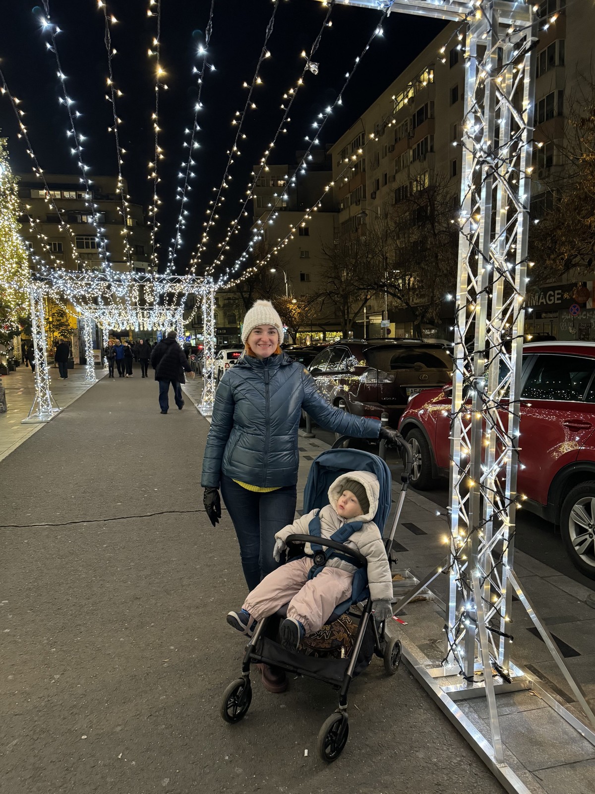 La teatrul în față sunt globuri și lumini, plus o sanie mare, cu doi reni în mărime aproape naturală. Este la liber acolo, se urca lumea în ea pentru fotografii, se făcuse chiar o coadă de copii atunci când am trecut noi.