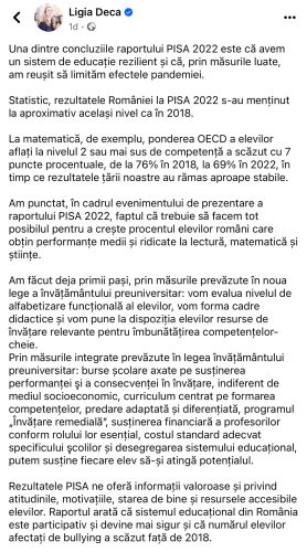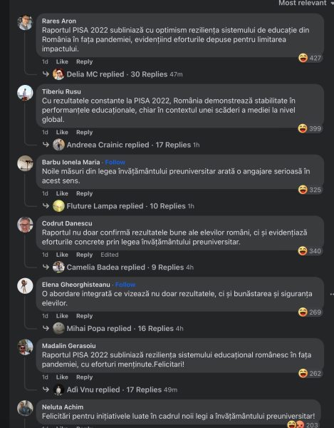 Într-o postare pe Facebook, laudă realizările și rezultatele testului. Învățământul românesc este la același nivel că în 2018! De prost, aș adăuga eu. Mă mir că nu îl compară cu cel din 1932 ca să ne demonstreze cât de bine ne merge sub bagheta ei de conducător. Încă o veste bună: “rezultatele tării noastre au rămas aproape stabile.”