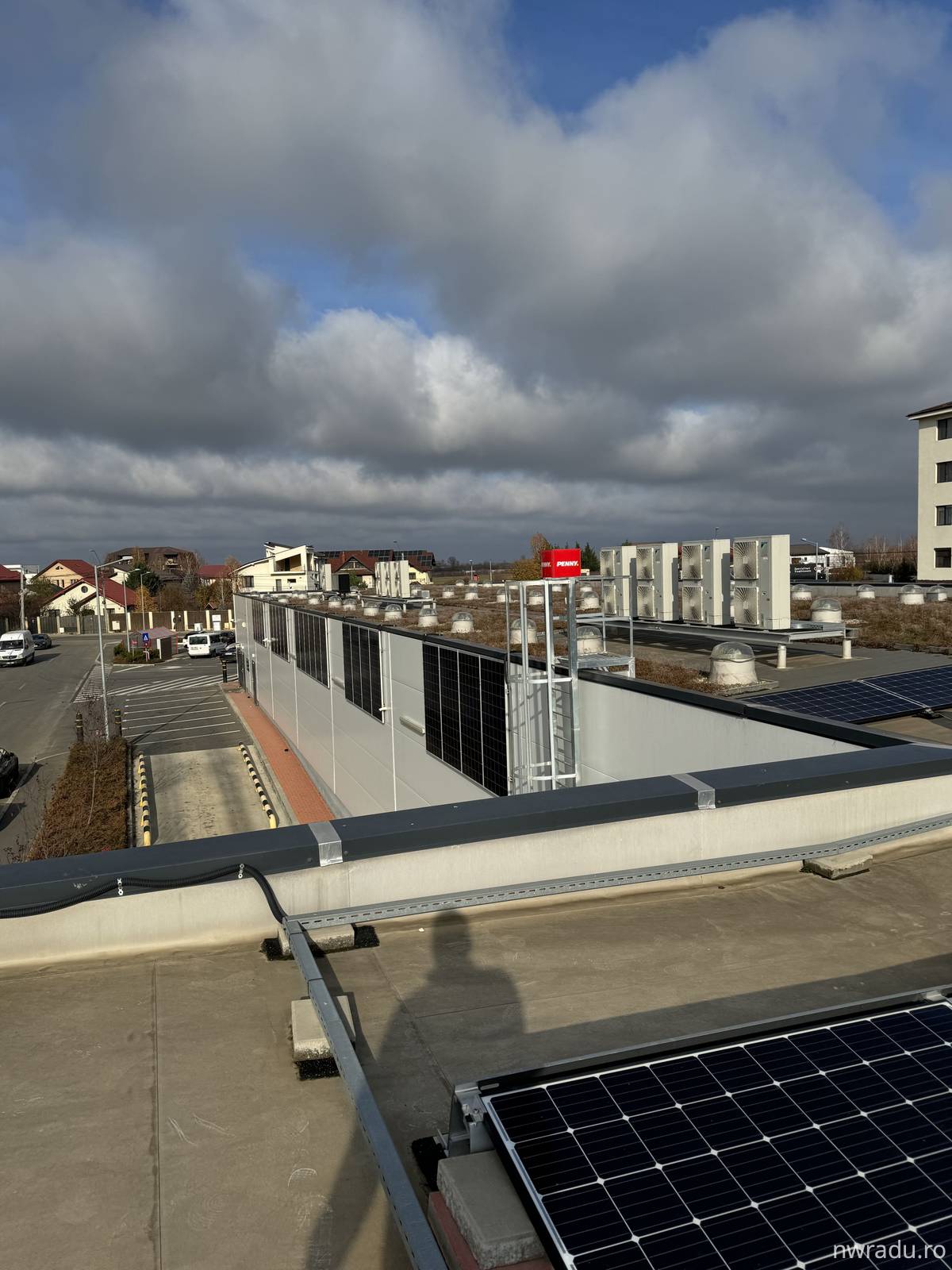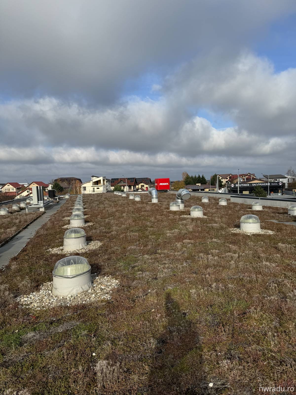 Acoperișul magazinului este spațiu verde și întreținut bine. Frumoasă ideea. Tot pe acoperiș (și pe o laterală) sunt și o mulțime de panouri fotovoltaice, asigurând o parte din necesarul de electricitate din magazin. Din ce am înțeles, nici un magazin PENNY nu mai folosește energie termică obținută din combustibili fosili. Energia electrică consumată este fie produsă intern prin panouri fotovoltaice, fie achiziționată cu certificate care atestă originea din surse regenerabile.