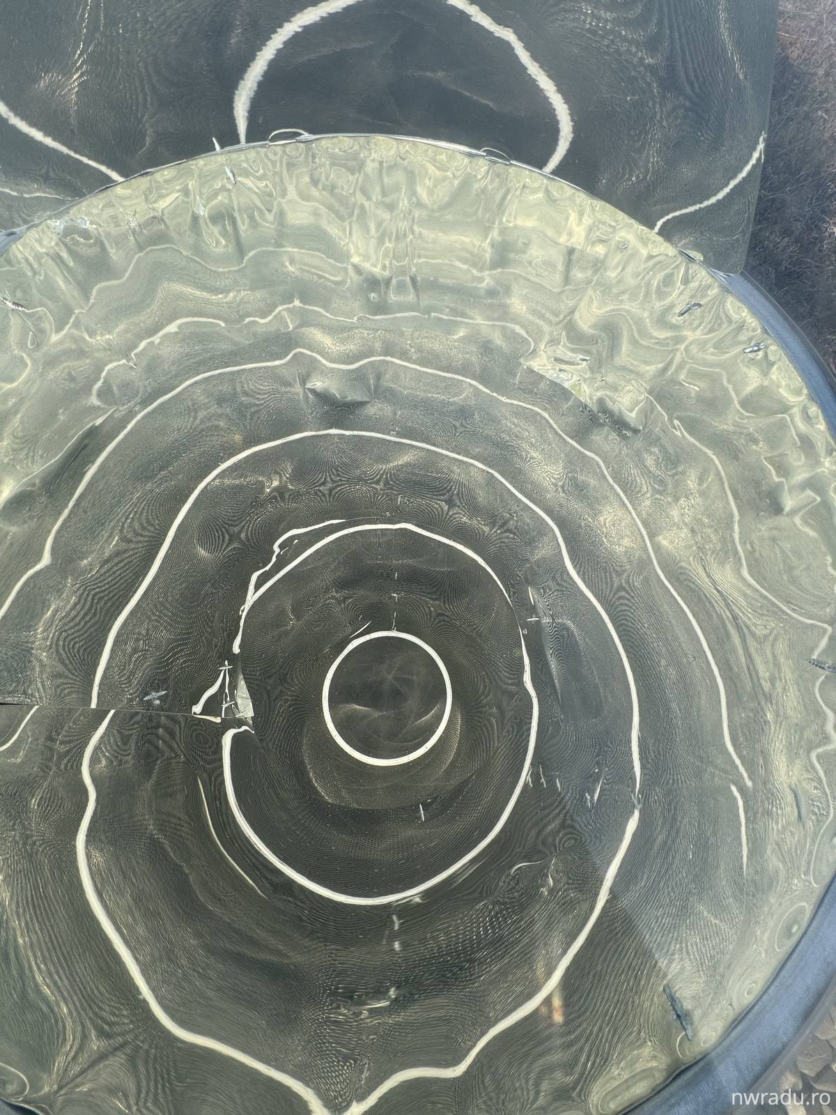 M-am urcat și pe acoperișul clădirii ca să-l văd. Este ca un coș de casă, acoperit sus ca să nu intre apă și praf în el. Trucul util este că pereții interiori sunt capitonați cu un soi de material reflectorizant, cu foarte multe celule care împreună reflectă atât de multe raze de lumină încât amplifică lumina disponibilă natural. Știu că nu se văd bine, sunt greu de fotografiat prin capacul de plastic.