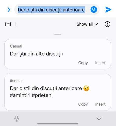 Și tastatura Samsung, care este o variantă de Swiftkey de fapt, are AI pentru reformulare și funcționează și în limba română. Uneori cu rezultate ușor amuzante, dar tot mi se pare un lucru bun că există. Poate că unii o vor utiliza.