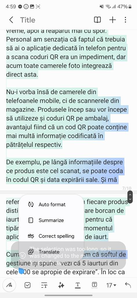 Samsung Notes poate rezuma notițele tale, dar le poate și formata automat. Am văzut pe net cum lua o listă neformatată de orașe și le grupa pe continente și le făcea listă cu bullets. Eu l-am folosit pentru a rezuma text luat cu copy-paste din altă parte.