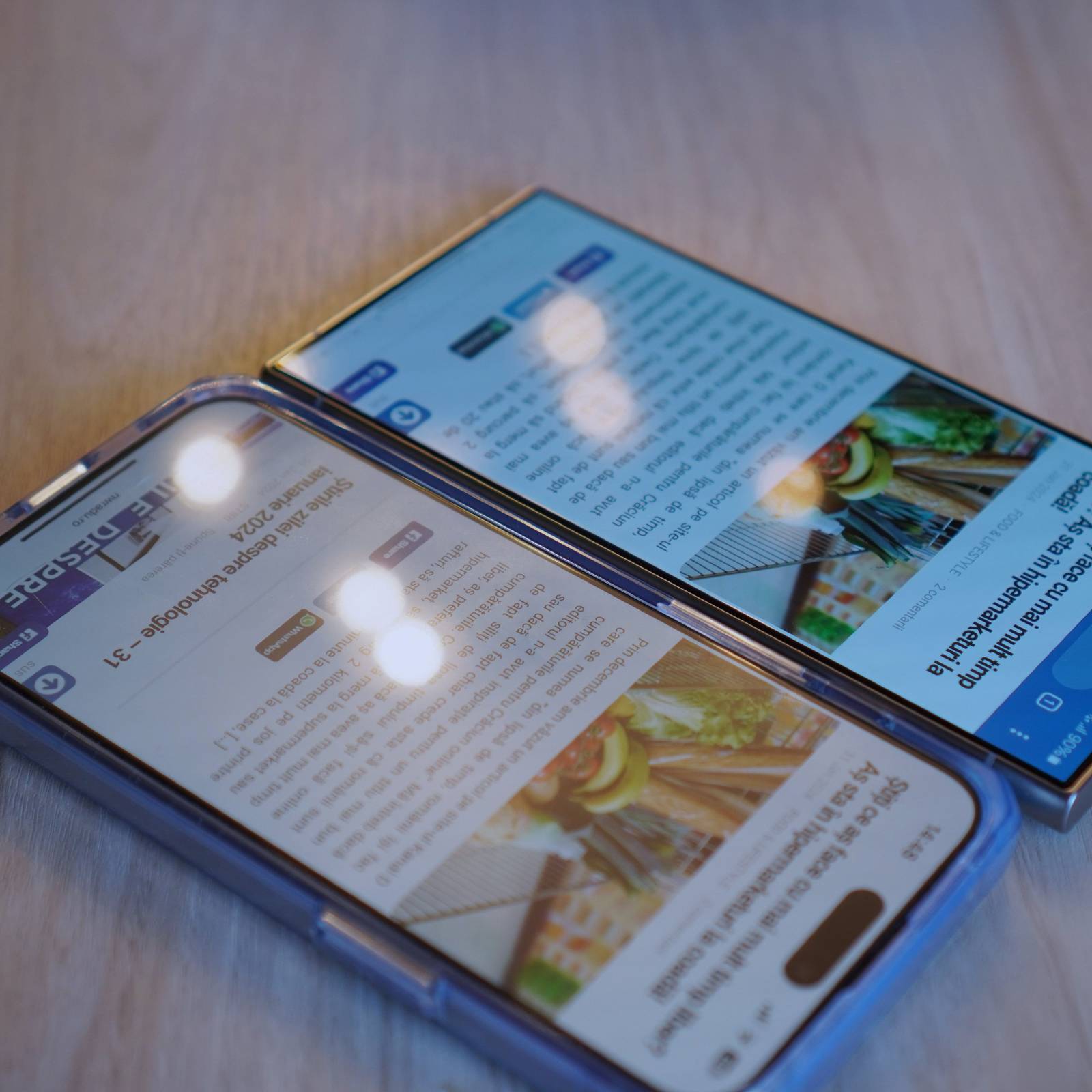 Mai mult, nu știu exact cum au făcut această sticlă Armor, dar reflectă mult mai puțin din luminile ambientale în ecran, este mult mai mată decât altele din piață. Îmbunătățirea asta este foarte ușor de sesizat, iată mai jos o comparație cu iPhone 15 Pro Max și observați cum pe Samsung becurile lustrei mele se reflectă mult mai atenuat, la fel și lumina din fereastră.