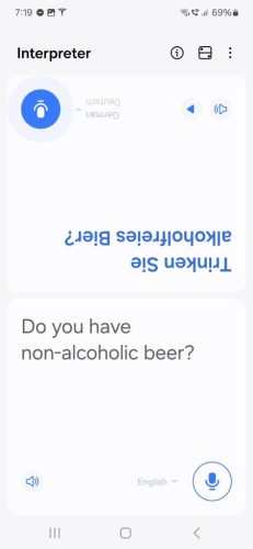 Facepalm. Eu nu știu germană, dar tot îmi dau seama că „trinken sie” nu înseamnă „do you have”, ci „do you drink”. Mai bine cu germana mea de baltă decât cu „interpretorul” AI.