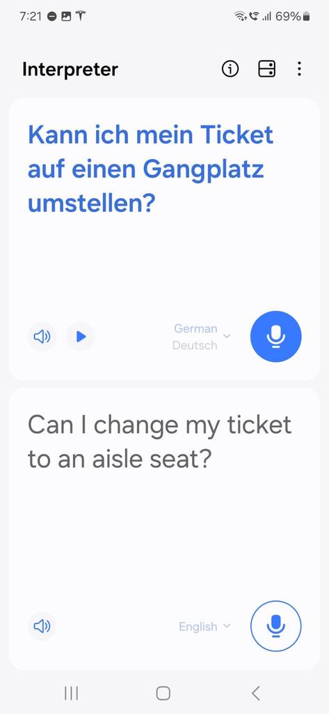 Chiar și fără română la bord, tot rămâne o unealtă excelentă câtă vreme știi engleza. Interpretorul are o interfață split screen, în partea de jos tu apeși un buton și vorbești în engleză ceva, iar în partea de sus apare traducerea în cealaltă limbă aleasă de tine, ba chiar cuvintele respective sunt pronunțate de o voce convingătoare în acea limbă.