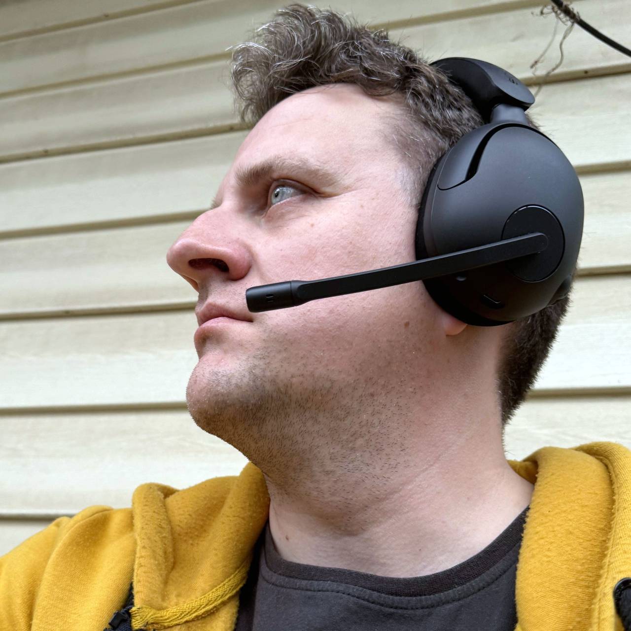 Microfonul este nedetașabil și legat pe mijlocul cupei stângi. Îl poți roti însă de la gură și până în poziția verticală, iar tija sa este ușor deformabilă pentru a-l apropia mai mult sau mai puțin de gură. Tot pe stânga se află o rotiță de volum, în trepte, și mufele jack audio și USB-C.