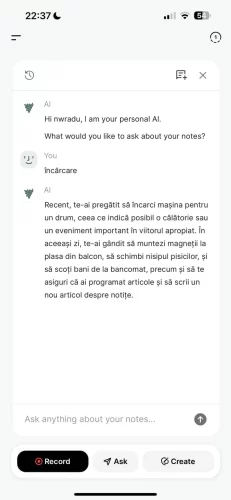 Odată ce ai notițe, poți căuta prin ele. Search-ul este de fapt un fel de asistent AI mai complex, dar se descurcă bine și pentru căutare. Întrucât înțelege ce vrei, nu trebuie să cauți exact cuvântul folosit. Eu, de exemplu, am avut “încarc” în notiță, dar am căutat după “încărcare” și a găsit imediat ceea ce trebuia.