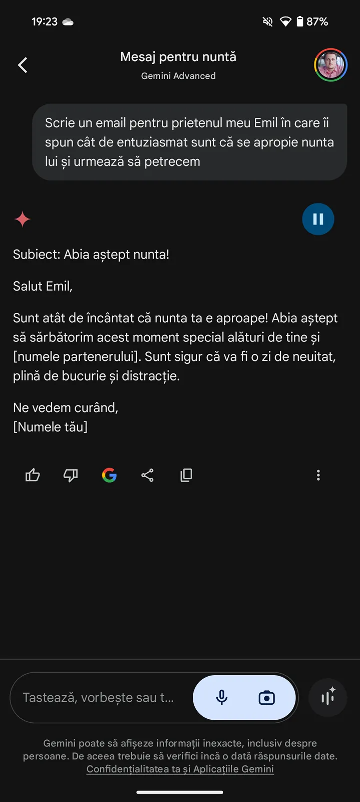 De exemplu, ai Gemini Advanced la dispoziție și îi poți cere orice, de exemplu să compună un mesaj către cineva prin care îi spui că regreți că nu poți ajunge la nunta lui. Știți deja funcțiile generative ale AI-urilor, nu mai intru în detalii, dar ideea este că pe Pixel sunt disponibile la o apăsare lungă pe On/Off.