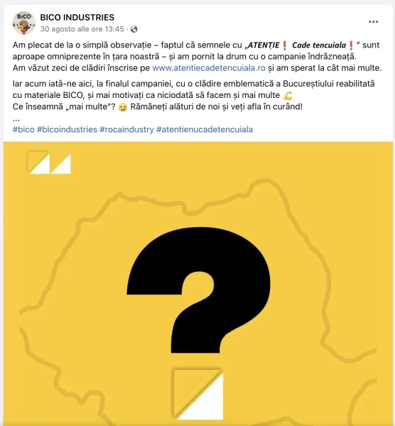 Am crezut că este o inițiativă a Primăriei Generale și un mesh făcut pentru a se lăuda cu lucrări de reabilitare prin oraș. Se pare, însă, că este o inițiativă privată a unui producător de armături de fibră de sticlă numit Bico. Blocul respectiv este unul istoric, se numește clădirea Malaxa-Burileanu, și probabil că Bico i-a reabilitat fațada pe banii ei.