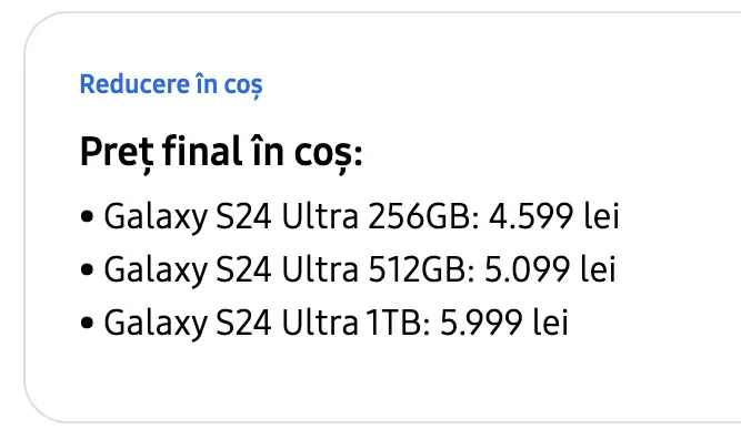 Ofertă bună pe Samsung.ro la Samsung S24 Ultra. Telefoanele sunt listate la prețul full, dar mergeți prin procesul de achiziție și în coș va fi aplicat un discount mare, care duce prețurile la: