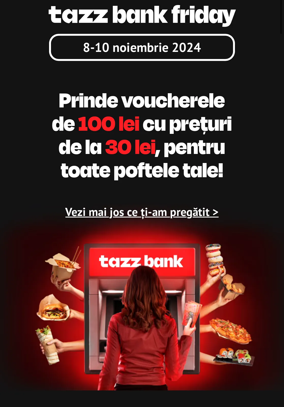 TAZZ va avea clasicul lor Bank Friday. Poți cumpăra vouchere la restaurante, plătind mai puțin decât valoarea lor. Cel mai bun va fi un voucher de 100 de lei disponibil la 30 de lei, dar din anii anteriori știm că sunt valabile doar la anumite restaurante.