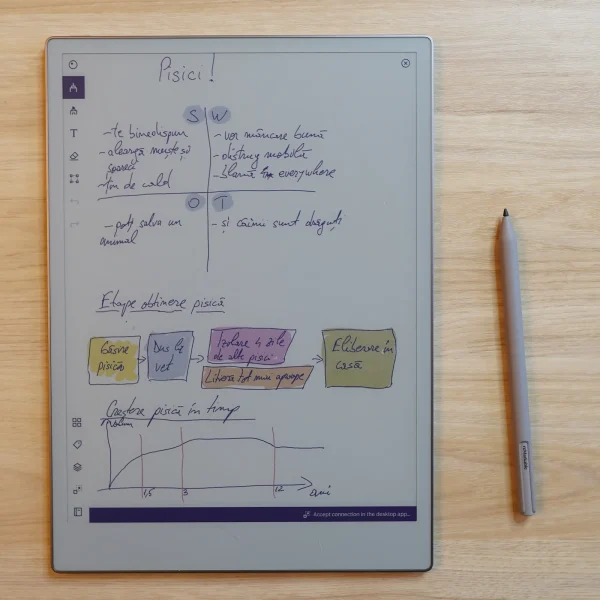 ➡️ ecranul și stylusul ei imită aproape perfect feelingul de a scrie pe hârtie. Le-a ieșit excelent acest aspect. Am încercat să iau notițe și pe iPad Mini cu Pencil Pro, de exemplu, și nu m-am putut obișnui cu felul în care alunecă stylusul pe ecranul ei de sticlă. Pe Remarkable Paper Pro, însă, simt ca și cum aș scrie pe hârtie.