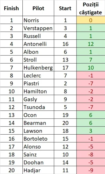 La vârf a fost simplu. Norris și Piastri au condus aproape întreaga cursă, prin ploaie și apoi uscat, cu Verstappen undeva la 15 secunde în spate. Apoi, cu vreo 10 tururi înainte de final, a venit din nou o aversă de ploaie care a dat totul peste cap. McLaren-urile au avut o mică ieșire în decor, 1️⃣Norris a câștigat cu greu cursa în fața lui 2️⃣Verstappen, dar Piastri a căzut pe ultimul loc și în cele din urmă a recuperat până pe locul 9.